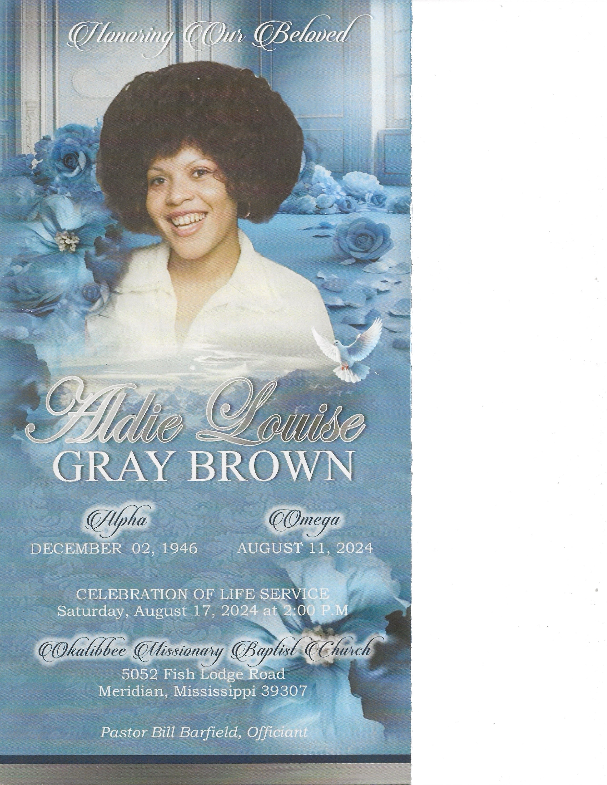 Aldie Louise Gray Brown was born December 2, 1946 to the late John Henry and Essie Mae Gray. At an early age, she confessed a hope in Christ and joined First Enterprise Missionary Baptist Church in Enterprise, MS. Louise, as she w Read Obituary