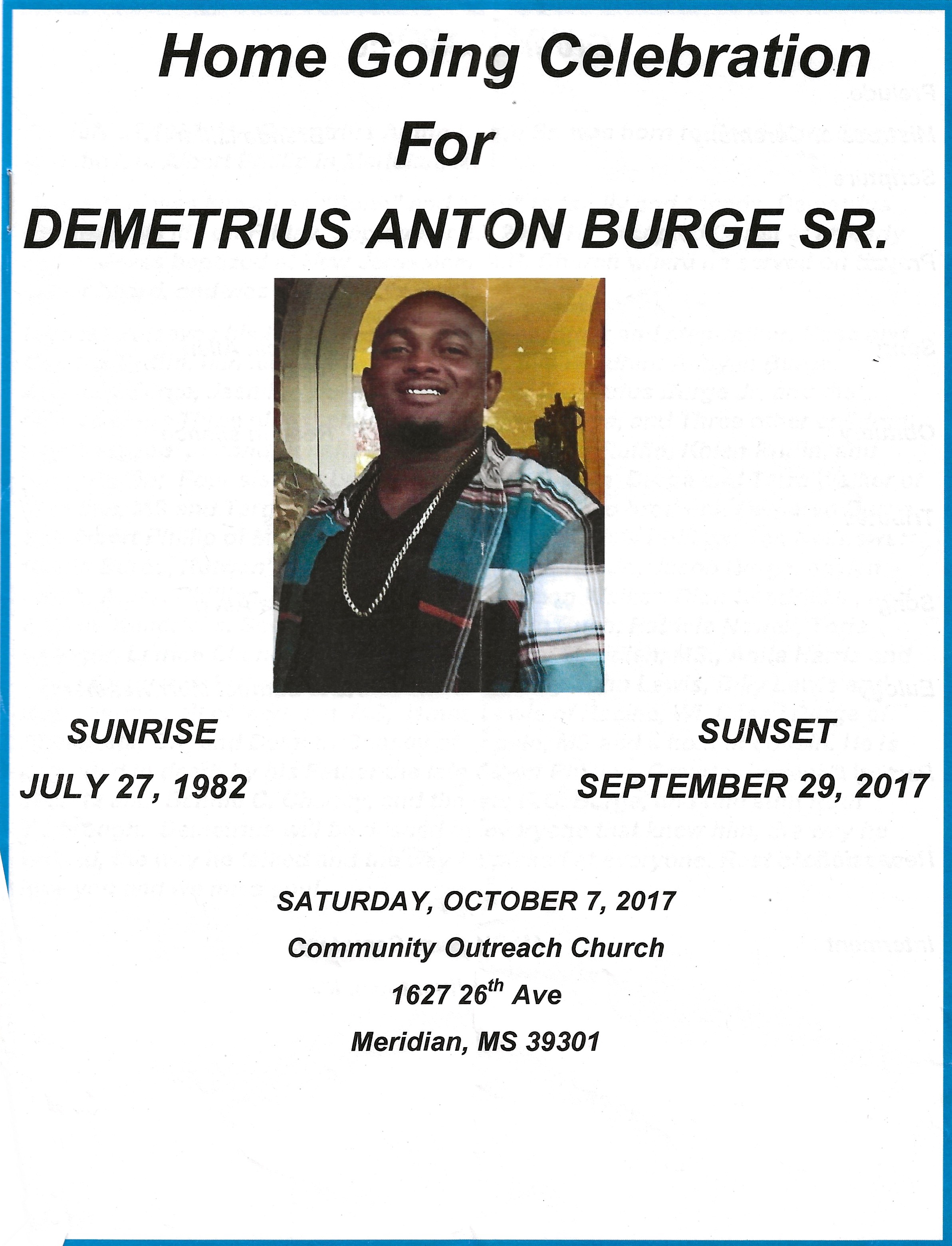 On July 27, 1982, Mr. Demetrius Anton Burge Sr. was born to Rose Mary Burge and the late Albert Phillip in Meridian, Ms. Demetrius was known as "Bone" and "Ton" to family and friends. Demetrius departed his life on Friday, Septemb Read Obituary