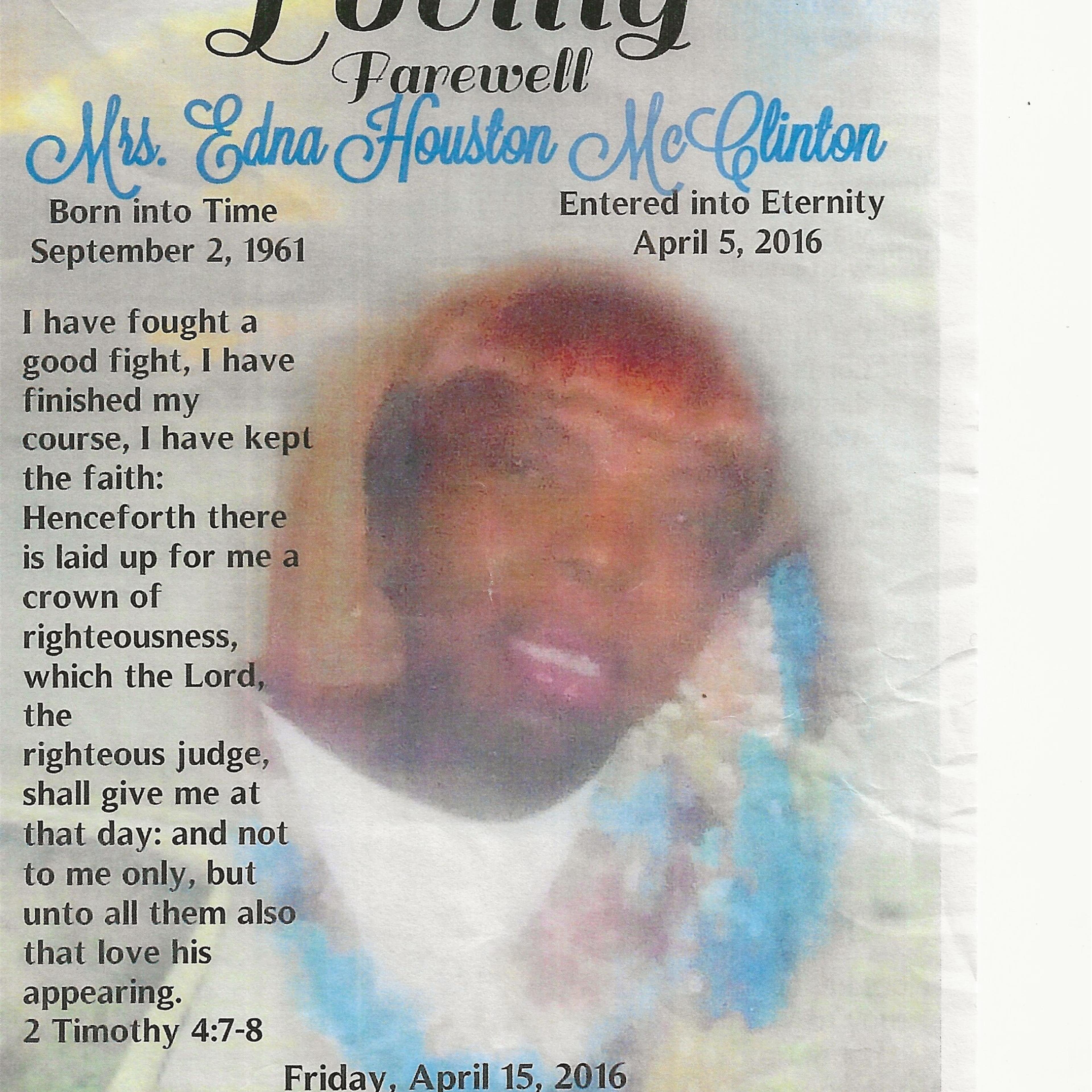 Edna Houston McClinton was born September 2. 1961 lo lhe late Georgia Mae Houston and the late Walter Houston in New Hope, Kemper County, Mississippi. Edna confessed Christ as her Lord and Savior as a child and believed that there Read Obituary