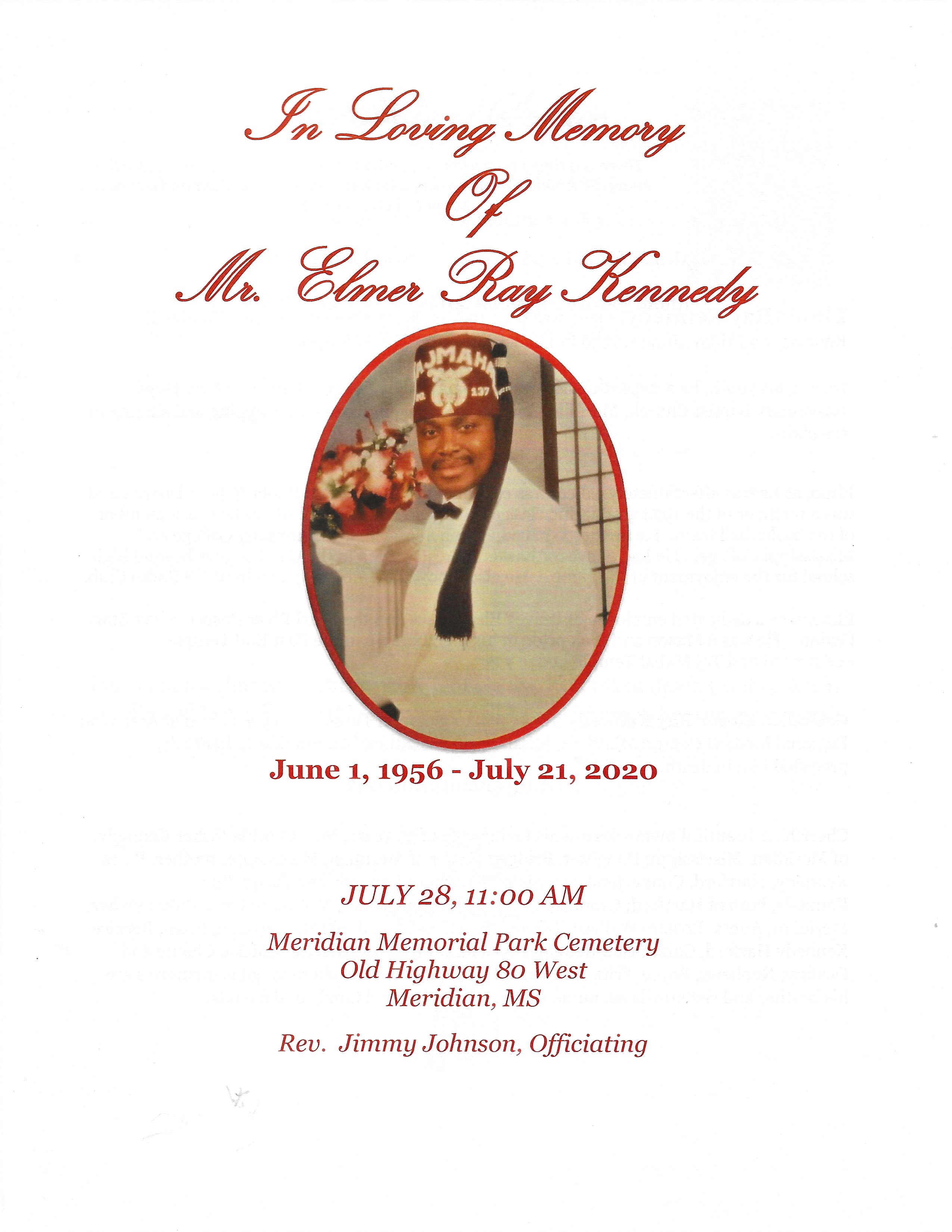 Elmer Ray Kennedy, a son, was born to Mrs. Betra Kennedy and Mr. Frankie E. Kennedy on Friday, June 1, 1956 in Lauderdale County, Mississippi. During his youth, he accepted Christ and was baptized by Rev. C. 0. Inge, at New Hope M Read Obituary