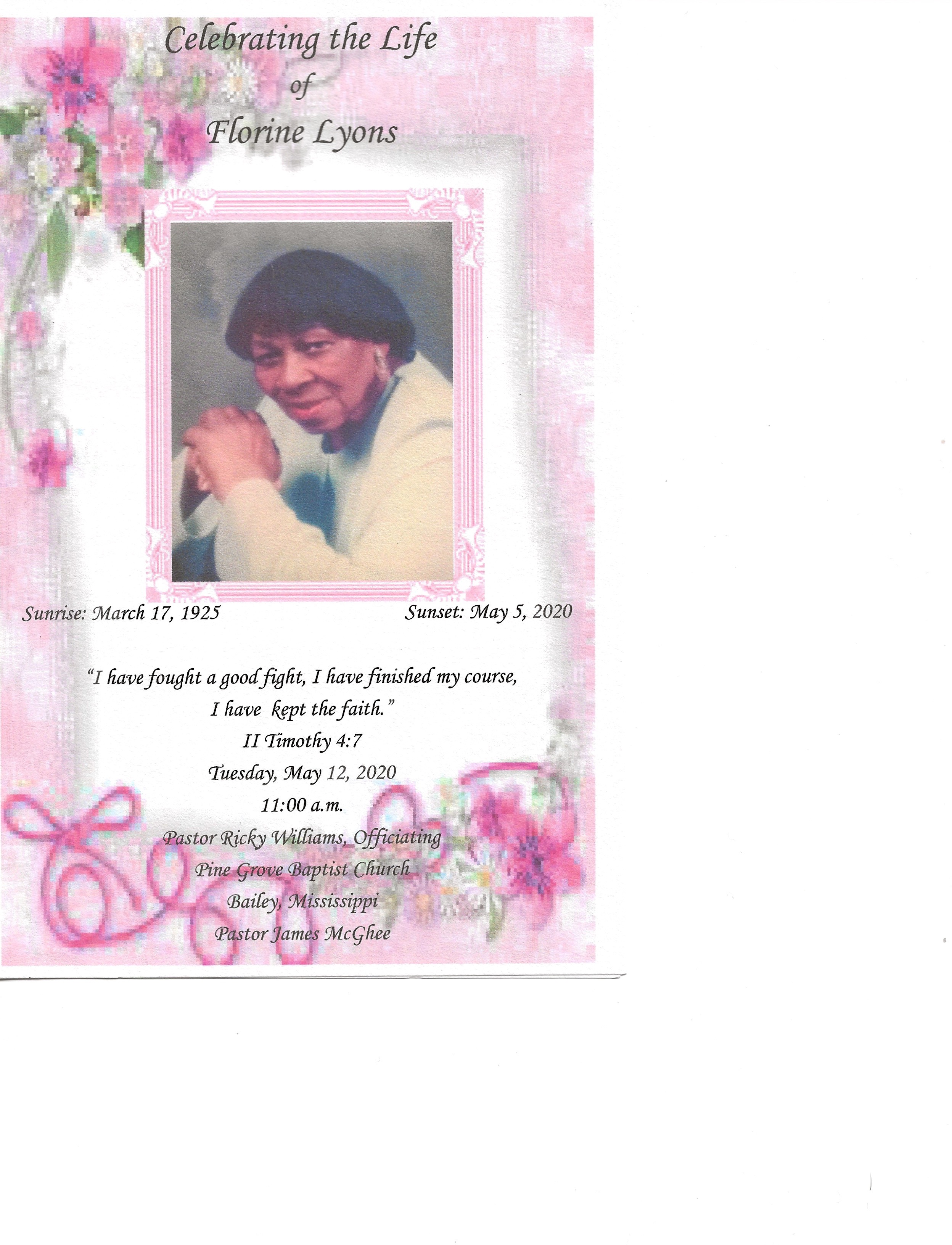 Mrs. Florine Holton Lyons was born in Bailey, Mississippi on March 17, 1925, to Willie Holton and Maybell Holton. She departed life peacefully on Tuesday, May 5, 2020. She was preceded in death by her husband Menzo Lyons, her son Read Obituary