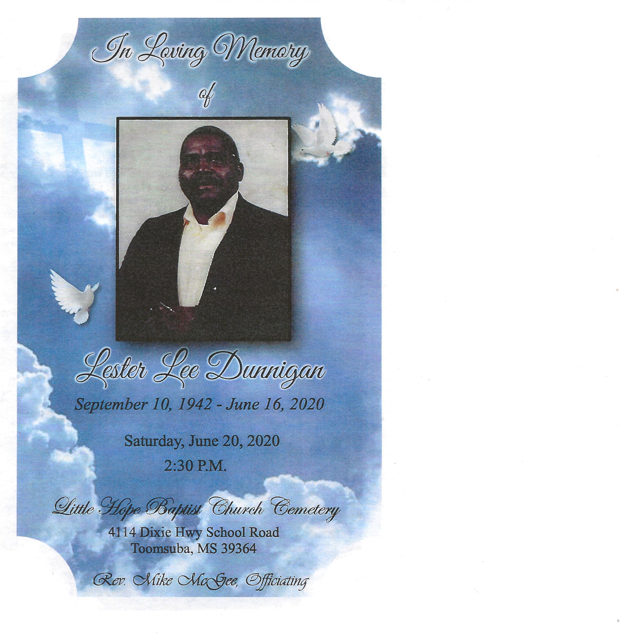 Lester Dunnigan was born on September 10, 1942 in Lauderdale County, Toomsuba, Mississippi to the late Whitehead Dunnigan I and Ruby Claire Toole Dunnigan. Lester accepted Christ at an early age and united with the Little Hope Bap