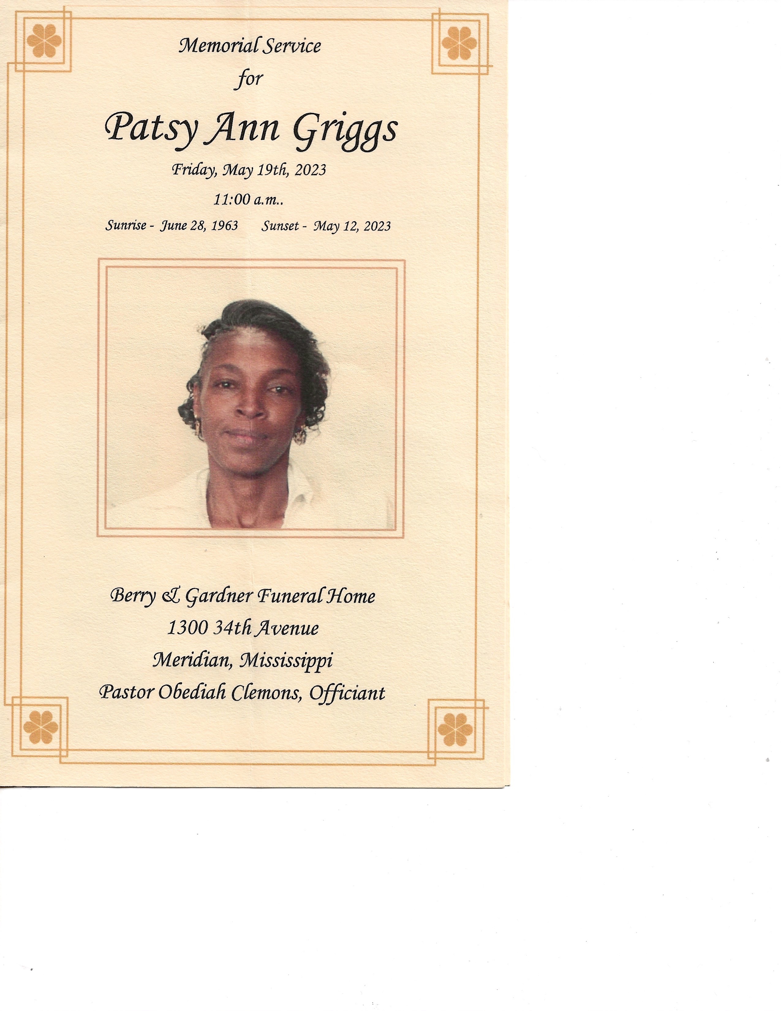 Patsy Ann Griggs was born June 28, 1963 to the late Jessie Griggs, Sr. and the late Juanita Dawson. She was predeceased by her mother and father. She attended Meridian Community college. She has been employed by Meridian Housing A Read Obituary