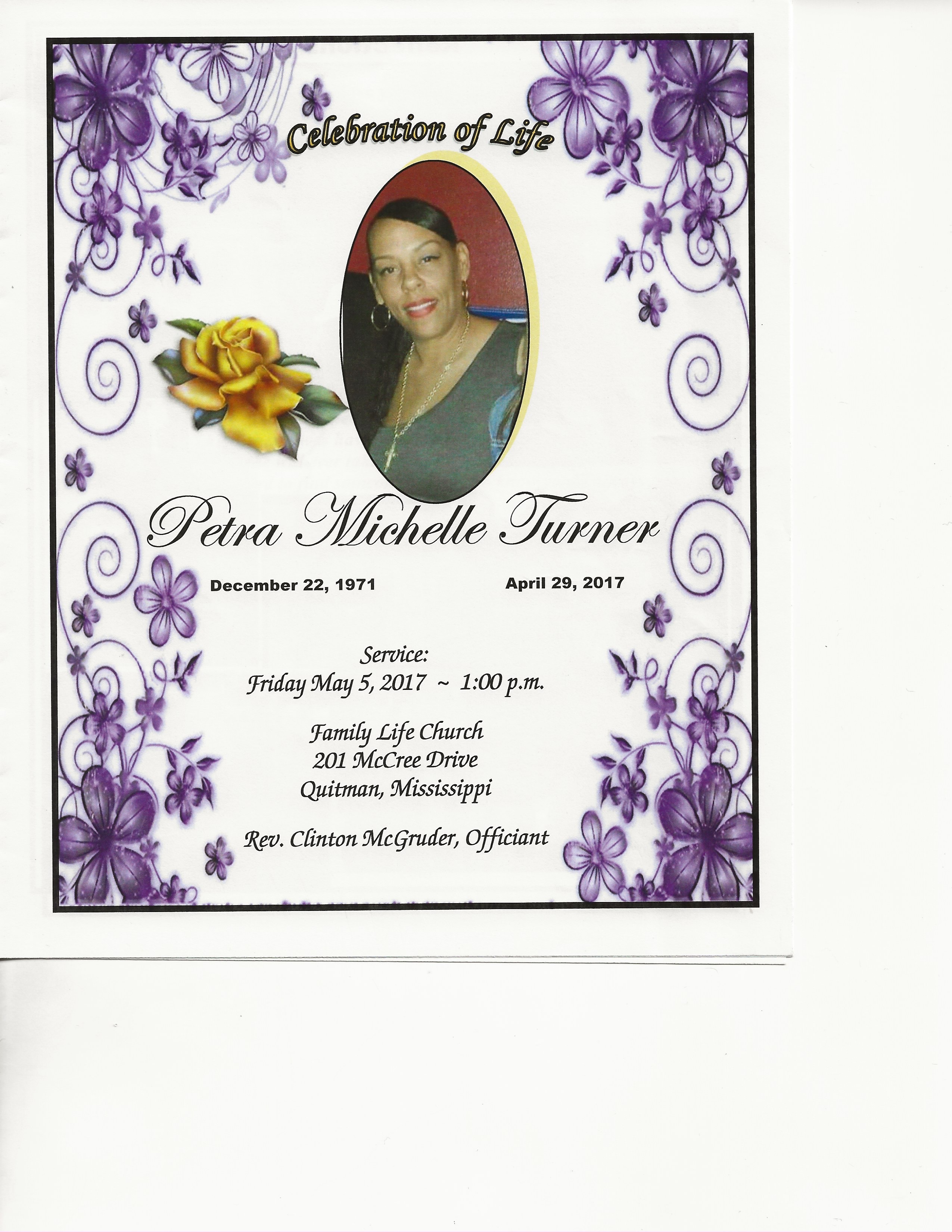Petra Michelle Turner was born December 22, 1971 to the union of Tommy and Dorothy Turner. She was a 1990 graduate of Grant Union High School in Sacramento, CA. Petra was a devoted employee of Quality Healthcare in Meridian, MS. H Read Obituary