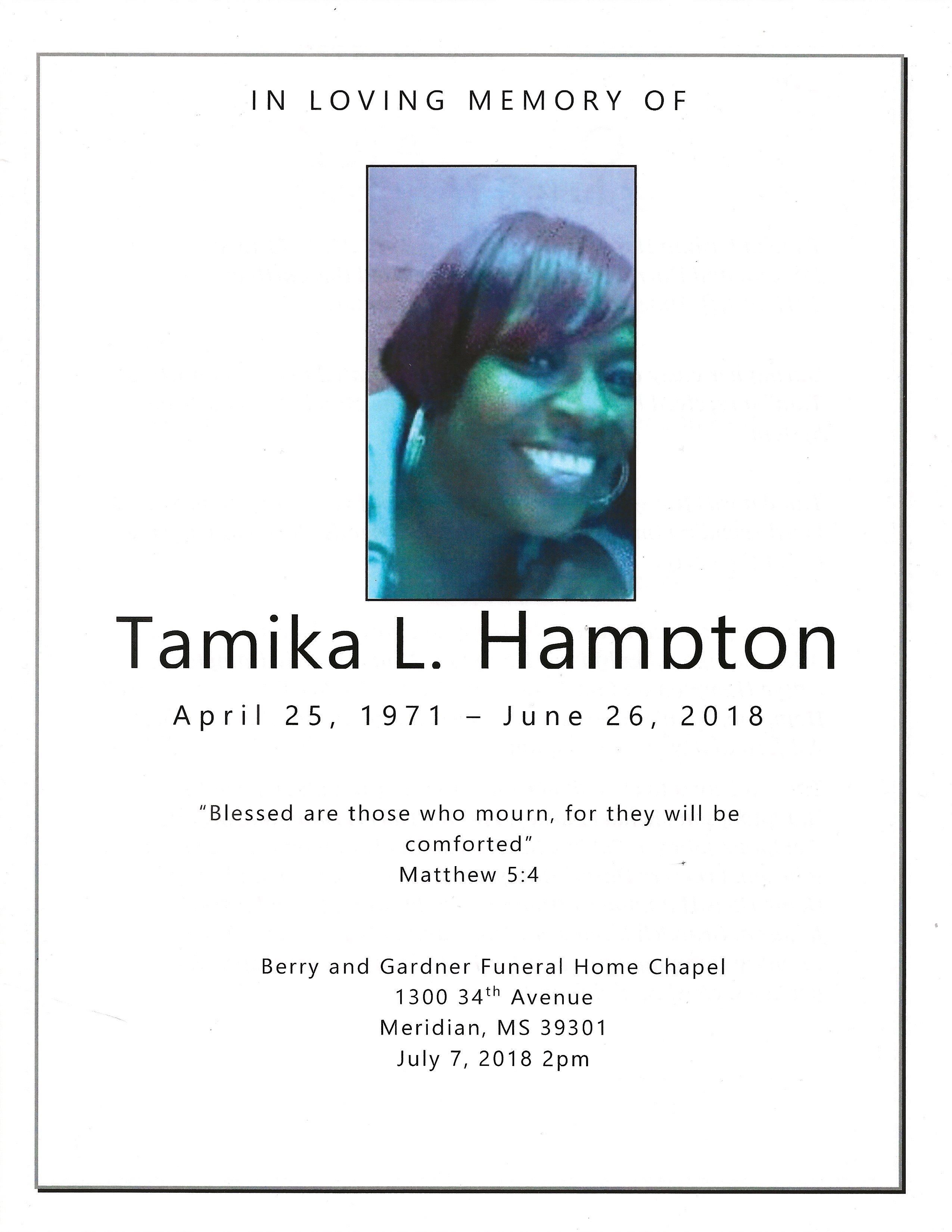 Tamika Lashun Hampton was born on April 25, 1971 to Stephanie Johnson and Darryl Hampton. She departed this earth on June 26, 2018 at Jeff Anderson Regional Medical Center. During her early childhood, her family relocated to Merid Read Obituary